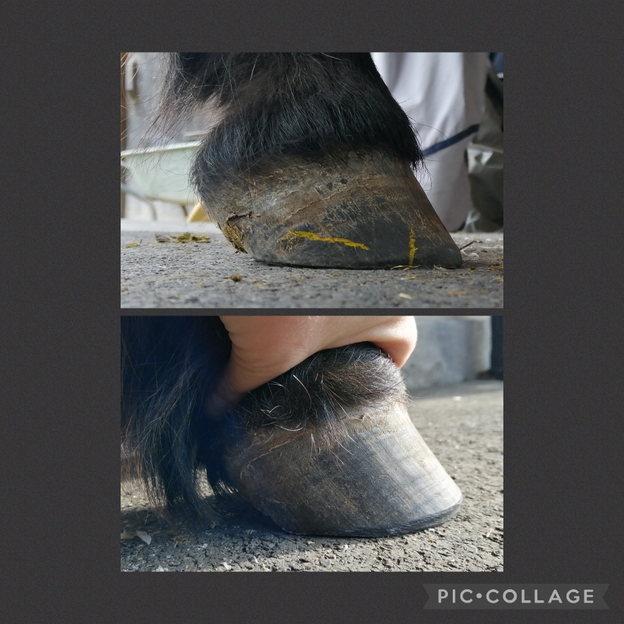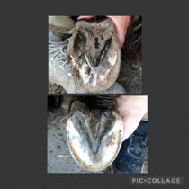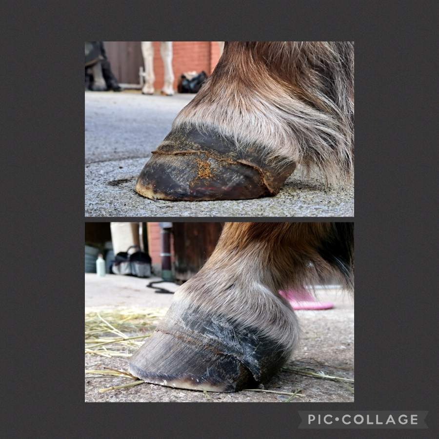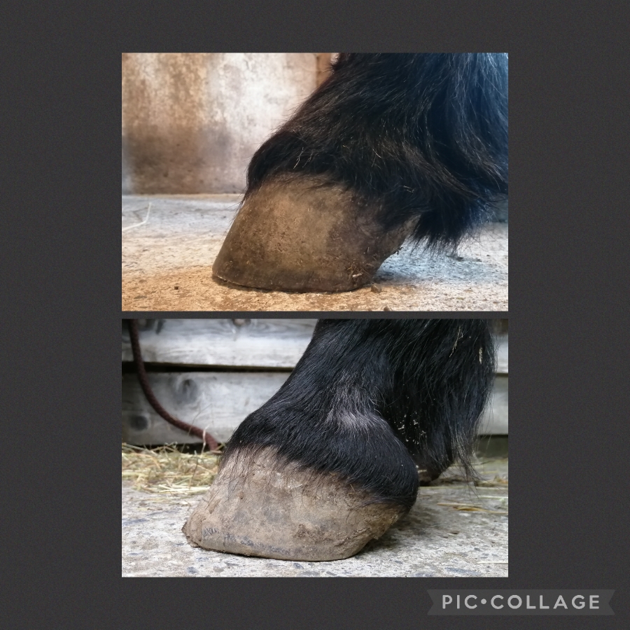 Zwei Monate Entwicklung. Dieser chronische Hufrehehuf entwickelt sich wunderbar. Stabilität fördern ist hier das A und O.